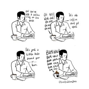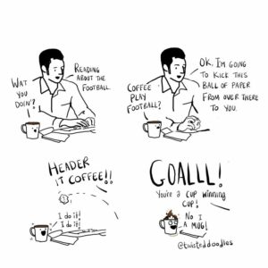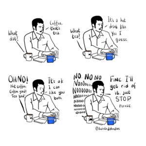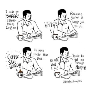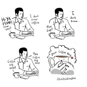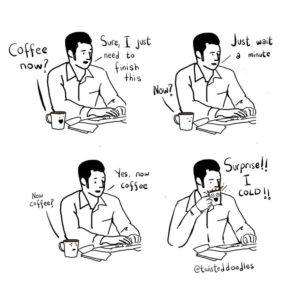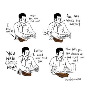 Ирландский иллюстратор Twisteddoodles представила новые работы, в которых изобразила отношения человека с чашечкой кофе.
