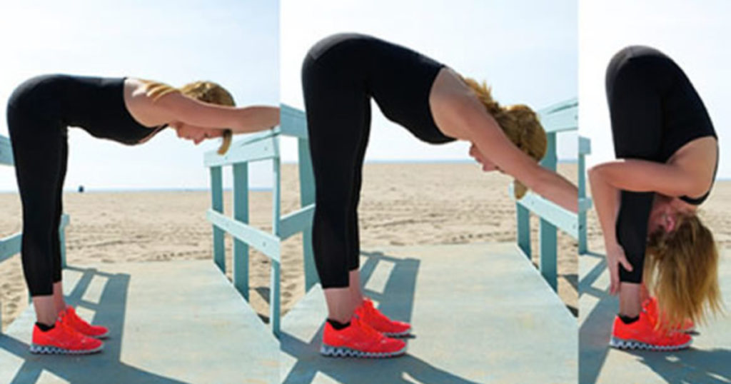 Станьте прямо — ноги шире плеч, руки висят вдоль тела. На выдохе начните опускаться корпусом вниз — головой к стопам. Во время данного движения ваша голова, шея и плечи должны быть расслабленными. Обхватите руками свои голени и задержитесь в такой позе от 45 секунд до 2 минут. Согните колени и медленно вернитесь в исходное положение.