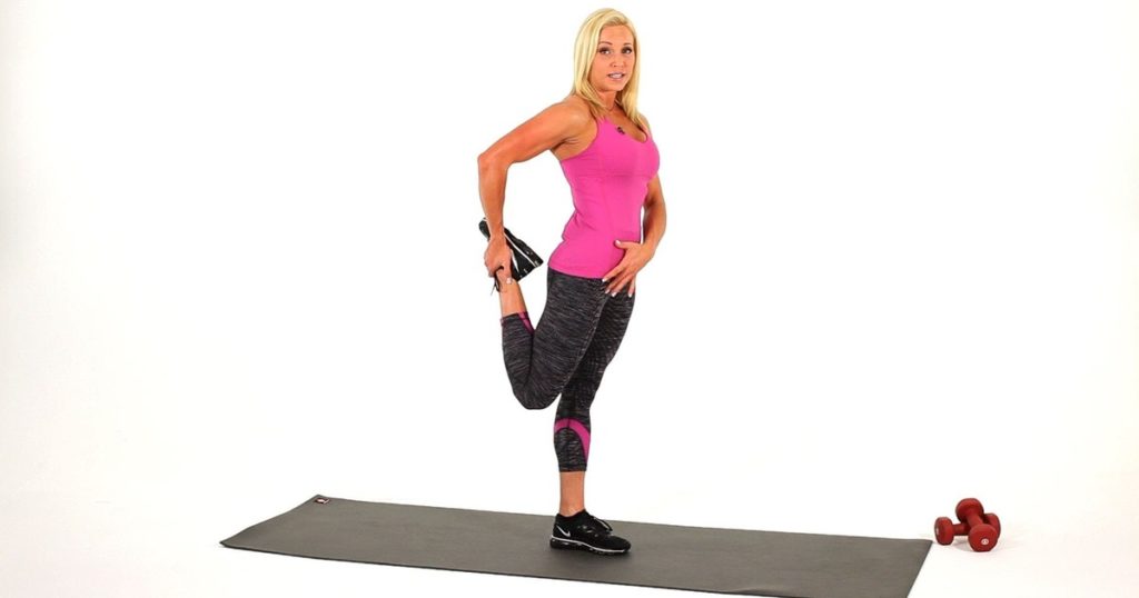Станьте прямо — ноги вместе, пресс напряжен, руки вдоль тела. Поднимите правую стопу к правой ягодице, держа ее правой рукой. Вытяните левую руку вперед или возьмитесь ею за стул, чтобы удержать равновесие. Давите правой стопой на ладонь и тянитесь ею назад, чтобы увеличить натяжение мышц. Постарайтесь простоять в такой позе около минуты перед тем, как сменить ногу.