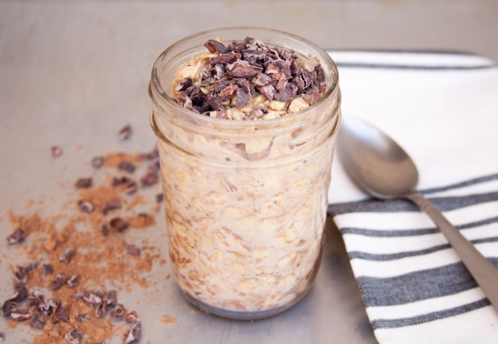 Поместите первые 5 ингредиентов в банку и оставьте на ночь в холодильнике. Утром добавьте арахис и шоколадные хлопья.