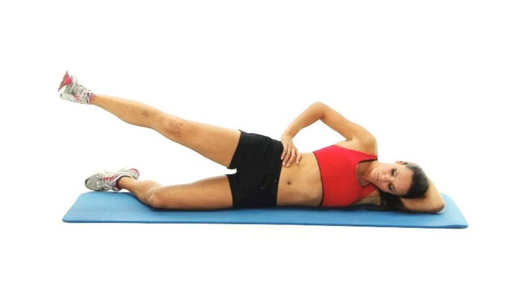 Лягте на правую сторону. Согните правую ногу, а левую немного приподнимете над ковриком. Продержитесь в таком положении в течение пяти секунд, затем медленно опустите ногу. Повторите 10 раз, затем смените сторону.