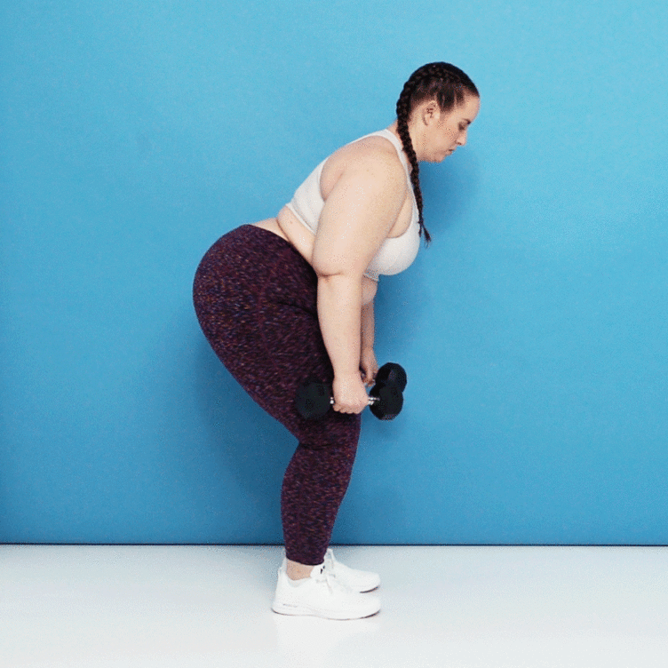 Немного согните ноги в коленях, наклонитесь с прямой спиной вперёд на 45°. Поставьте ноги на ширине бёдер. Каждая рука держит гантель. Руки свободно висят вдоль туловища. Отведите таз немного назад и прогните поясницу. Смотрите вперёд, на пол, чтобы шея со спиной образовала собой прямую линию. Потяните гантели к груди, держа локти близко к телу и сжимая лопатки в течение двух секунд в верхней точке. Затем выпрямите руки, заведя их назад, за спину. Сделайте паузу на секунду, а затем согните локоть и медленно опустите руки в исходное положение. Это – одно повторение.