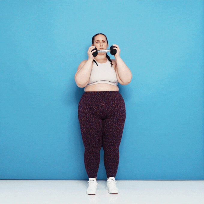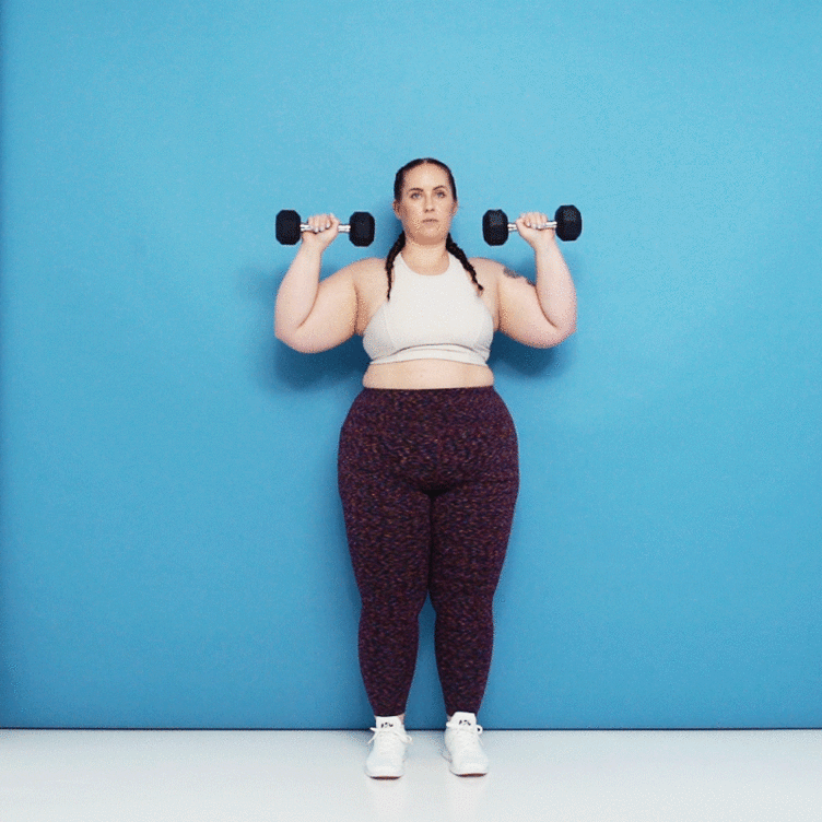Возьмите в каждую руку по гантели. Встаньте прямо, поставив ноги на ширине бёдер. Поднимите гантели до уровня плеч. Локти согнуты, ладони смотрят вперёд. Бёдра должны быть поджаты, мышцы пресса напряжены. Не выгибайте нижнюю часть спины. Она должна быть полностью прямой. Поднимите гантели вверх, полностью распрямив руки. Вернитесь в исходное положение и продолжайте поднимать гантели.