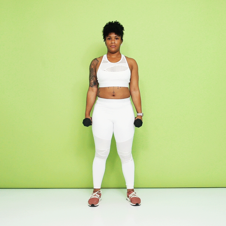 Встаньте прямо, поставив ноги на ширине бёдер. Каждая рука держит гантель. Слегка согнув руки в локтях, медленно поднимите руки вверх, перед собой, дойдя до уровня плеч. Напрягите мышцы пресса. Медленно опустите руки вниз в исходное положение. Затем, так же слегка согнув руки в локтях, поднимите руки в стороны. Медленно опустите их обратно вниз. Это – одно повторение.