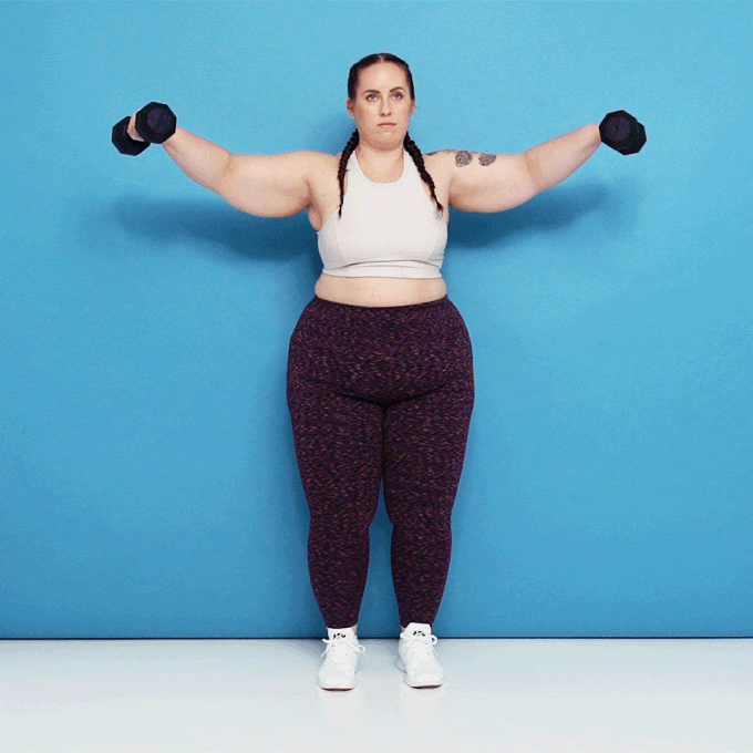 Встаньте прямо, поставив ноги на ширине бёдер. Каждая рука держит гантель. Медленно поднимите руки вверх, в стороны, дойдя до уровня плеч. Напрягите мышцы пресса, не поднимайте плечи. Медленно опустите руки вниз в исходное положение. Продолжайте поднимать и опускать гантели.