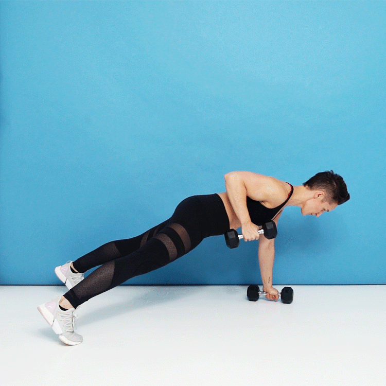 Примите положение планки на вытянутых руках. Поставьте ноги чуть шире ширины бёдер. Обе руки держат по гантели. Задействуйте мышцы пресса и ягодиц. Сделайте выдох и поднимите правую руку, чтобы сделать тягу. Задержите гантель на одном уровне с грудью. Вернитесь в исходное положение и сделайте то же для другой стороны. Это – одно повторение.