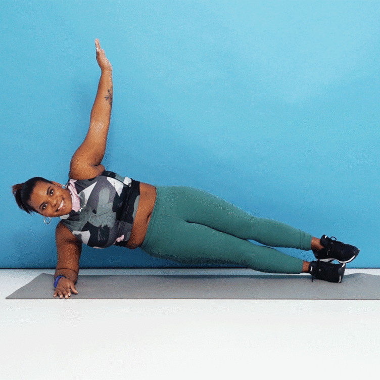 Примите положение боковой планки. Правая рука согнута в локте. Верхняя часть тела опирается на правое предплечье. Вытяните левую руку над головой (как на фото) или поместите её на левое бедро. Поднимите бёдра так, чтобы тело образовало собой прямую линию. Медленно опускайте бёдра к полу, держа мышцы кора напряжёнными, а спину ровной. Затем оторвите бёдра от пола, вернувшись в исходное положение. Это – одно повторение. Сделайте повторения на одной стороне, а затем повторите всё на другой стороне.