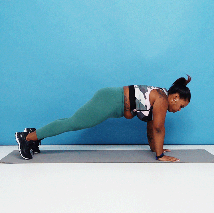 Примите положение планки на вытянутых руках. Руки на ширине плеч. Поставьте ноги на ширине бёдер. Задействуйте мышцы пресса и ягодиц. Опустите левую руку вниз, чтобы предплечье оказалось на полу. Затем сделайте то же самое с правой рукой. Следите, чтобы спина оставалась ровной. Выпрямите левую руку, а затем правую, вернувшись в исходное положение. Это – одно повторение. Старайтесь сделать так, чтобы бёдра не раскачивались сильно в стороны. Можете поставить ноги чуть шире, чтобы это было легче сделать.