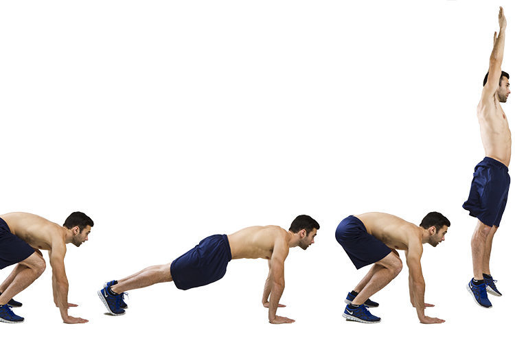 Выполните предыдущее упражнение «прыжки с приседаниями», но вместо того, чтобы приземляться в исходное положение, опуститесь телом вниз, опустив ладони на пол. Затем подпрыгните ногами назад, чтобы занять положение высокой планки. Можно сделать отжимание, либо сразу вернуть ноги к рукам. Поднимитесь, вернувшись в исходное положение. Это – одно повторение. Сделайте 2-3 набор по 10-15 повторений.