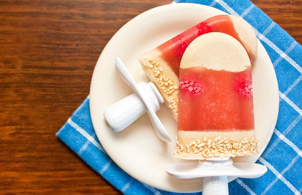 Корисне морозиво з желе та арахісової пасти має всього 200 калорій на порцію. Воно також складається з йогурту, меду, свіжої малини та насіння кунжуту.