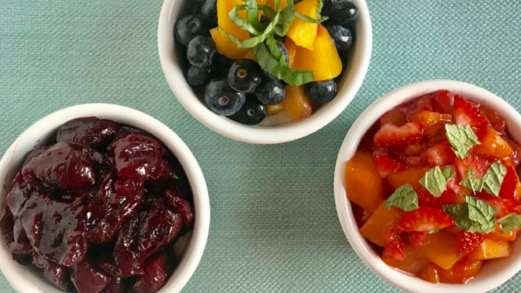 Смешайте вишни и ваниль, клубнику, манго и мяту, или чернику, персик, белый бальзамический уксус и базилик для вкусного, естественно сладкого десерта! Это прекрасный способ насладиться свежими или замороженными фруктами.