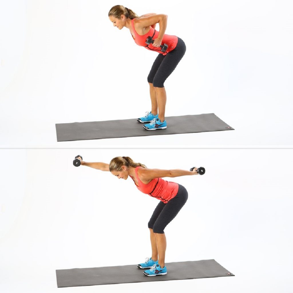 Встаньте прямо, поставьте ноги вместе, возьмите в руки гантели и держите перед собой. Наклоните корпус, прогнув поясницу. Начинайте сводить и разводить руки в стороны, не сгибая локти. Сохраняйте корпус неподвижным. Повторите 10 раз.