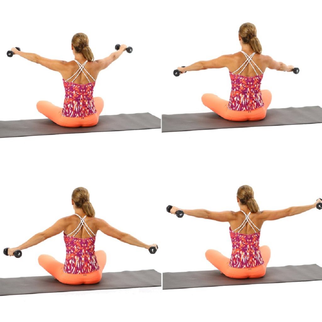 Сядьте на пол «по-турецки», возьмите в руки гантели и держите их перед собой, согнув локти под углом 90 градусов. Спину сохраняйте прямой. Начинайте сводить и разводить руки так, чтобы ваши локти были перпендикулярны плечам. Напрягайте мышцы рук. Повторите 10 раз.