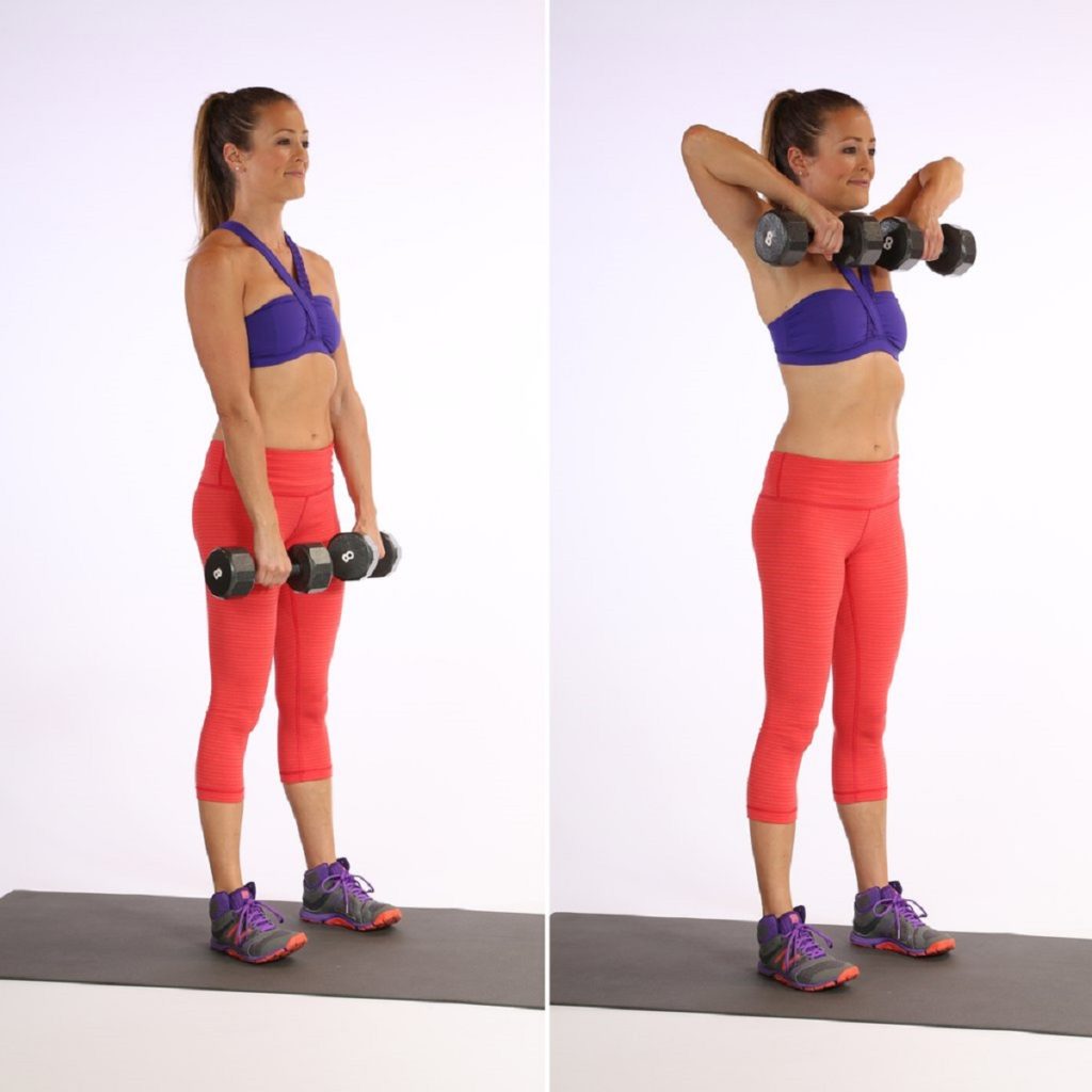 Встаньте прямо, поставьте ноги на ширину плеч, возьмите гантели в обе руки и держите их перед собой, слегка согнув локти и колени. Согните руки с гантелями, развернув локти вверх. Гантели должны двигаться вдоль тела, спина остается прямой. Достаньте гантелями до уровня подбородка. В верхней точке максимально напрягайте мышцы. Медленно верните гантели в исходное положение. Повторите 10 раз.