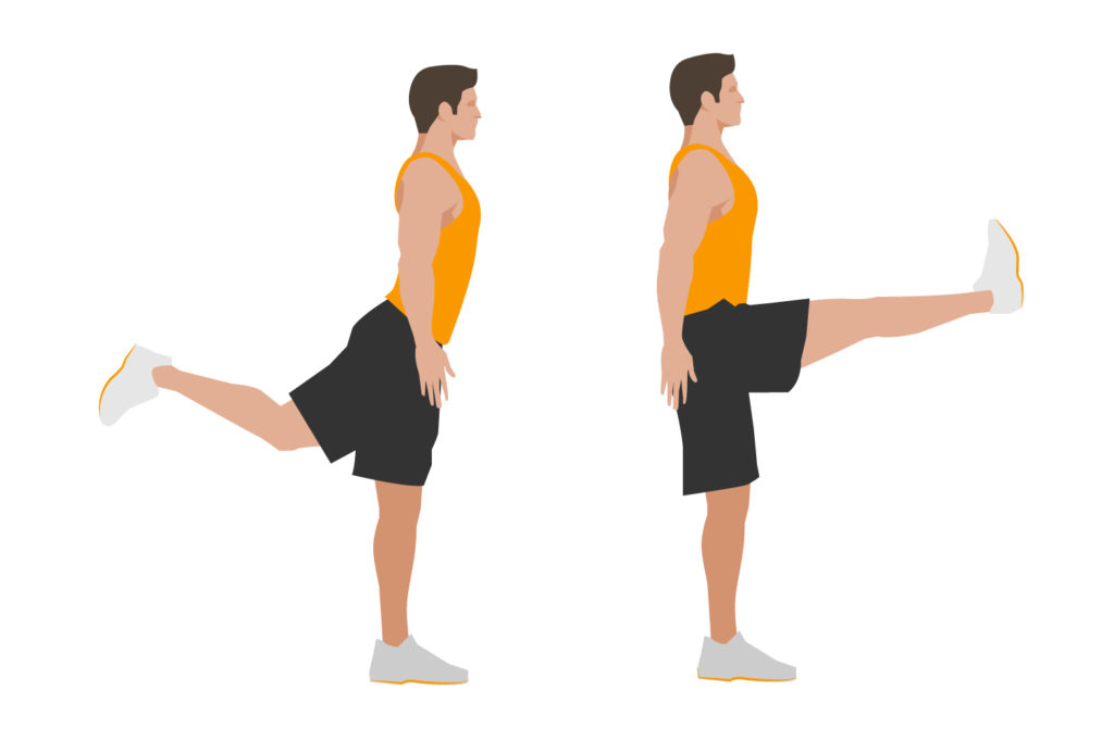 Встаньте прямо, поставьте ноги на ширину плеч, поднимите правую ногу и выполняйте махи вперед и назад 10 раз. Вернитесь в исходное положение и повторите махи левой ногой.
