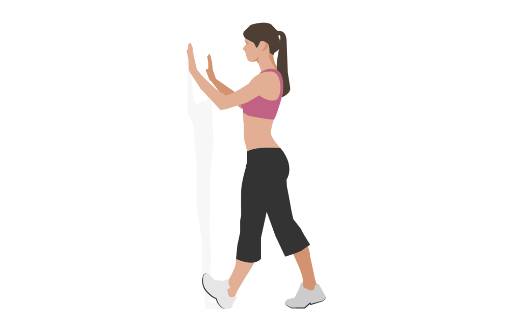 Встаньте прямо, лицом к стене. Обопритесь руками на стену. Сделайте шаг вперед правой ногой, немного согнув колено. Левую ногу отставьте назад. Почувствуйте натяжение в икроножной мышце. Вернитесь в исходное положение и повторите упражнение 5 раз, чередуя ноги.