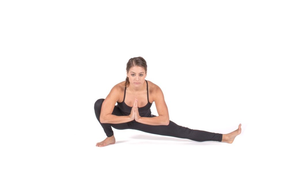 Встаньте прямо, поставьте ноги широко. Опуститесь в боковой выпад на правую ногу, не сгибая левое колено. Не отрывая пятку от пола, тянитесь бедрами максимально вниз. Задержитесь на несколько секунд и повторите упражнение в другую сторону.