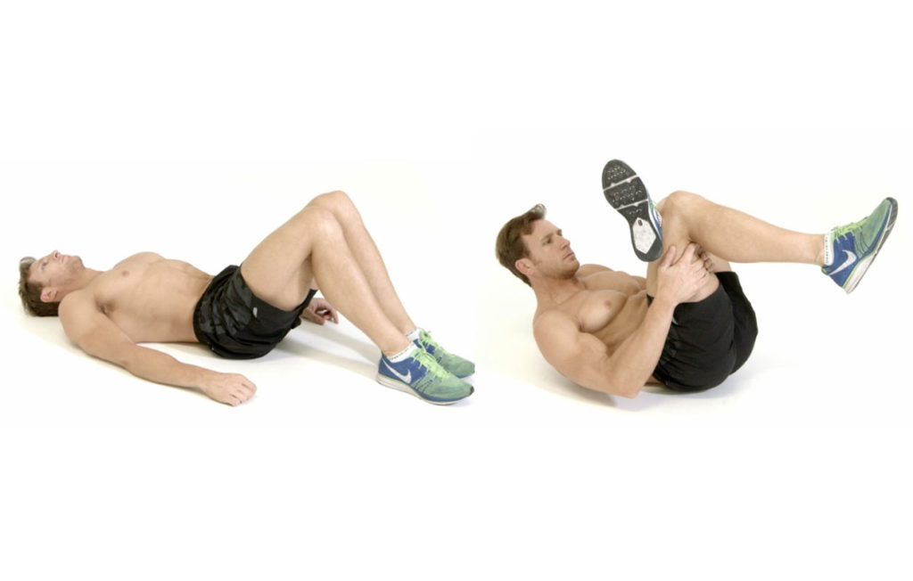 Ложитесь на спину, ноги согните в коленях. Правую ногу поместите поверх левого колена, обхватите бедра обеими руками и подтяните ноги к груди. Задержитесь на несколько секунд. Вернитесь в исходное положение и поместите левую ногу поверх правого колена. Снова подтяните ноги к груди, задержитесь и вернитесь в исходную позицию.