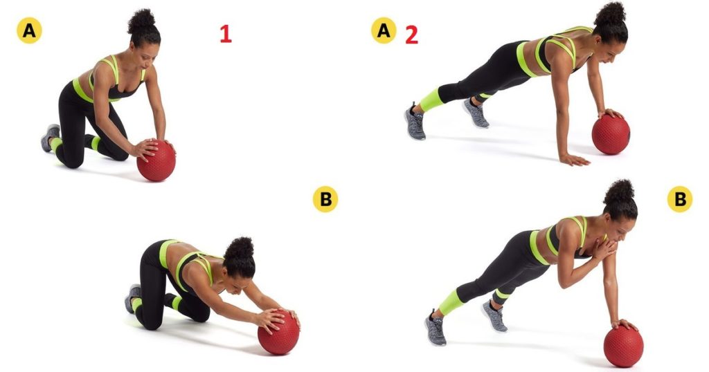 Станьте на колени, соединив пятки и расставив в стороны колени. Сделайте упор руками на медицинский мяч так, чтобы ваше тело от макушки до колен образовало прямую линию. Держась за мяч, медленно двигайтесь вперед и опускайте торс как можно ближе к полу. За один подход сделайте 6-8 повторов.