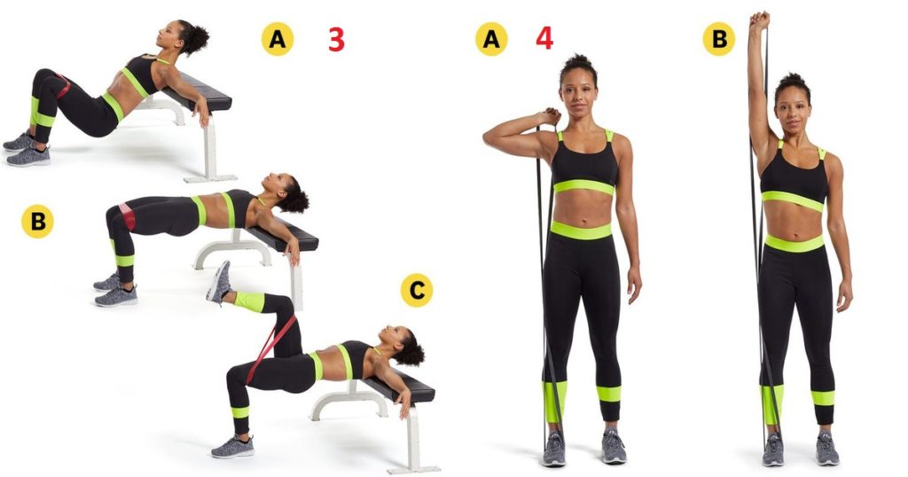 Закрепите небольшой эспандер выше колен. Примите упор верхней частью тела о скамью. Слегка приподнимите таз от пола. Делая толчок пятками и сжимая ягодицы, поднимайте таз, пока тело не станет параллельно полу. Затем вернитесь к старту, снова поднимите таз, а также правую ногу — так, чтобы в колене получился прямой угол и голень была параллельна полу. Опуститесь вниз и повторите то же для другой ноги. Выполните 20 раз.