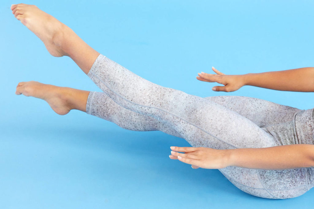 Лягте спиной на коврик. Ноги вместе, ладони под ягодицами. Поднимите ноги вверх так, чтобы они с верхней частью тела образовали угол 90 градусов. Напрягите мышцы пресса. Это – исходное положение. Опустите медленно ноги вниз, не касаясь ими пола. Выдохните и вернитесь в исходное положение. Сделайте 2 сета по 7 повторений.