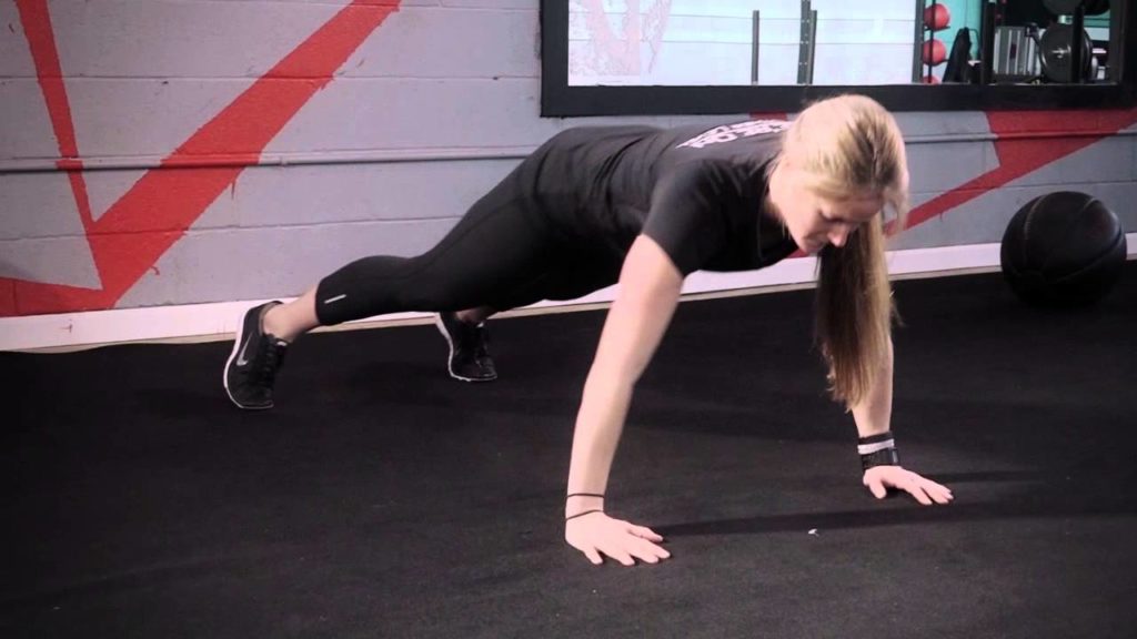 Займите положение для отжиманий. Ноги расположите вместе, а руки – на ширине плеч. Теперь оторвите левую руку от пола и отведите ее к правому плечу. Вернитесь в исходное положение и повторите, но уже с правой рукой. Выполните 3 набора из 10 повторений.