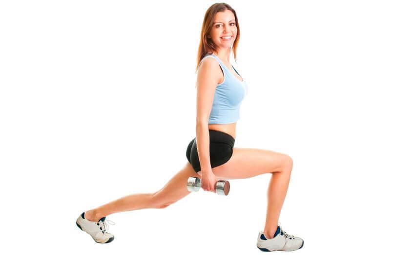 Возьмите в руки гантели и сделайте выпад левой ногой вперед так, чтобы она согнулась под углом 90 градусов. В это время правая нога должна полностью выпрямиться. Повторите 15 раз.
