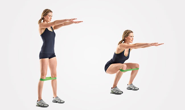 Исходное положение – стоя, ноги на ширине плеч, прямые руки держите перед собой. Лента натянута точно под коленями. Медленно делаете приседание. Положение рук не меняется. Строго следите за спиной, она зафиксирована четко. Пятки не отрываются от пола. Лента фиксирует положение коленей. В ягодицах почувствуйте напряжение. Распрямляйтесь также медленно.