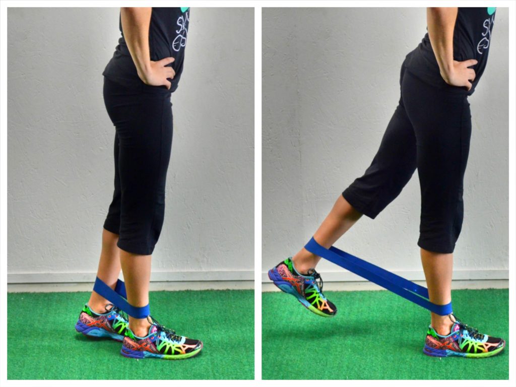 2. В том же положении, только ноги прямые, а фитнес-резинка на голени. Начинайте поднимать вверх ногу. Стопа при этом должна быть параллельно земли.