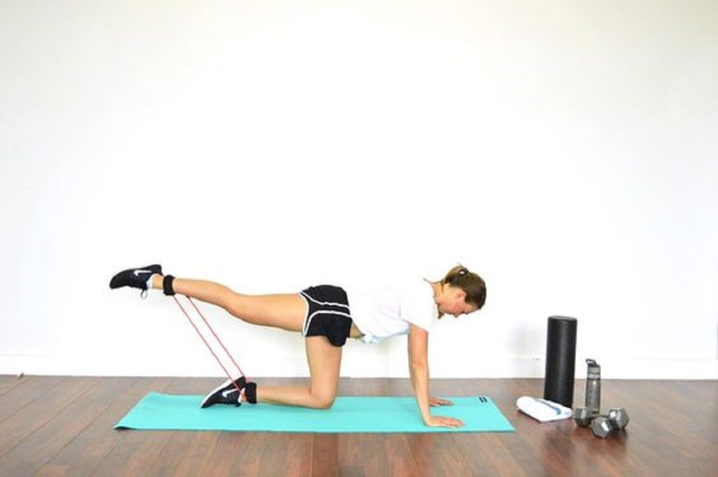 6. Встаньте на четвереньки. Фитнес-резинка должна находиться в районе колен. В таком положении начинайте поднимать одну ногу. При этом стопа должна быть направлена вверх. Это упражнение поможет накачать заднюю поверхность бедра и ягодицы.