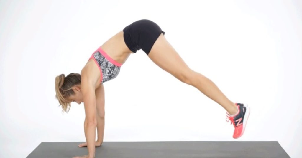 Примите позу собаки мордой вниз, правую ногу поднимите как можно выше, не сгибая колена. Затем подтяните правое колено к груди и вернитесь в исходное положение. Повторите тоже самое с другой ногой.