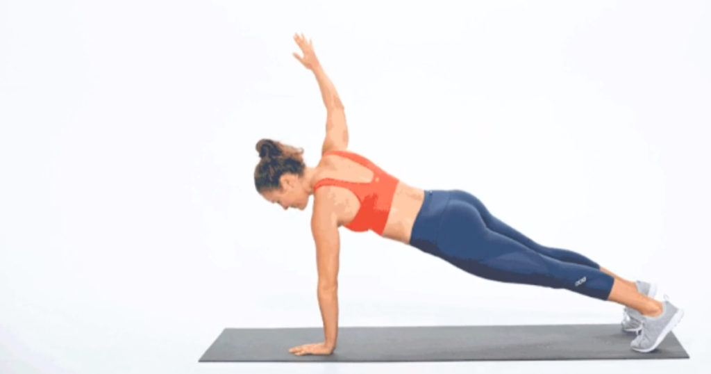 Примите положение планки на прямых руках, поднимите левую руку над головой и выполните круговое движение, затем снова поставьте ладонь на пол. Повторите тоже самое с другой рукой.