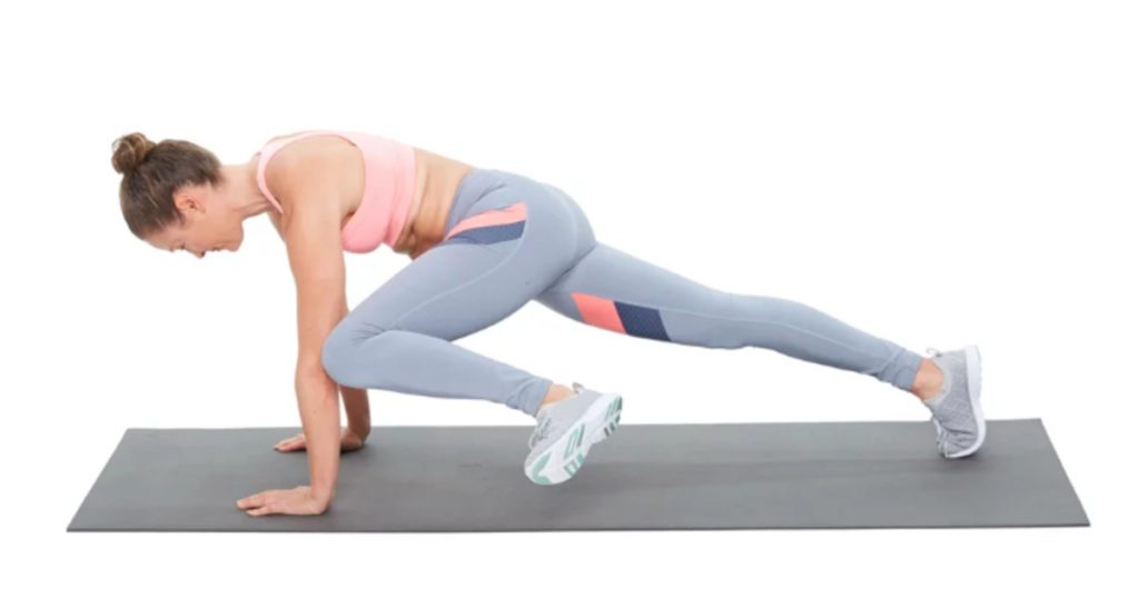 Встаньте в положение планки, подтяните правое колено к правому локтю, затем левое колено к левому локтю. Продолжайте чередовать стороны, не округляя спину.