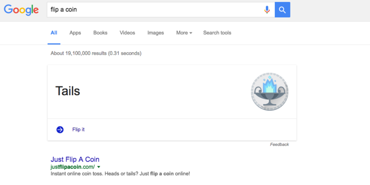 4. Если вы не можете принять решение, Google поможет вам – подбросит монетку. Введите в поиске «flip a coin» и вопрос решен.