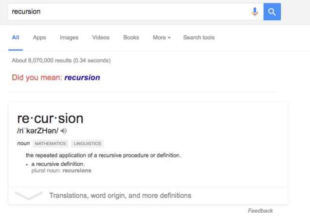 Это термин программирования, ссылающийся на функцию, которая обращается к себе. Google, когда выдаст результат, спросить «возможно вы имели в виду «recursion»? Теперь попробуйте нажать на это. Ну как? Получилось?