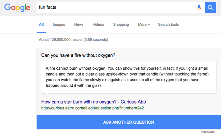 9. Если вам скучно, введите в поиске «fun facts» или «I’m feeling curious». Как результат, Google выдаст ответ на случайный интересный вопрос.