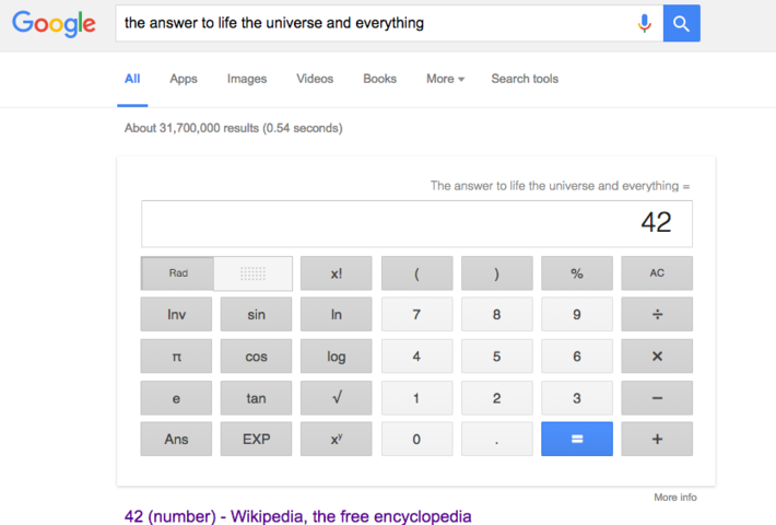 10. Хотите знать ответ на вопрос о жизни, Вселенной, обо всем? Поищите «the answer to life, the universe, and everything”. Google выдаст вам результат — калькулятор с цифрой 42. Это отсылка к книге Адамса Дугласа «Автостопом по Галактике».