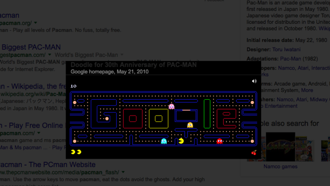 14. В результате поиска слова «Pacman» вы сможете поиграть в интерактивную игру Google, созданную для Doodle. Она отпраздновала 30-летний юбилей желтых ребят еще в 2010 году.