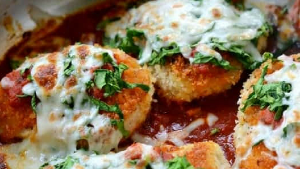 Посыпьте курицу солью и перцем. Смешайте панировочные сухари и сыр пармезан в маленькой миске. Опустите котлеты в панировку и обжарьте на масле с обеих сторон. Заберите курицу из сковородки и вылейте туда половину соуса или кетчупа. Осторожно положите курицу сверху. На каждую котлету положите еще соус, ¼ чашки нарезанного шпината и две столовые ложки моцареллы. Протушите несколько минут, пока сыр не начнет плавиться.
