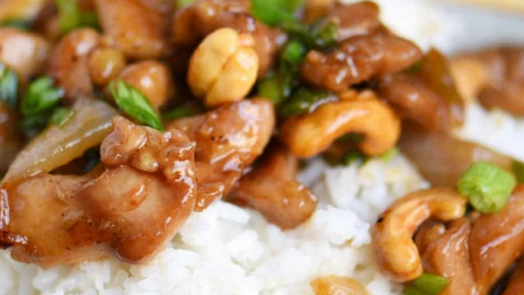 В большой кастрюле нагрейте масло на среднем огне. Приготовьте курицу, часто помешивая, до золотистого коричневого цвета. Добавьте лук и готовьте еще 3 или 5 минут, часто помешивая, пока лук не станет мягким и полупрозрачным. Добавьте чеснок и тушите еще минуту, затем добавьте рисовый уксус и готовьте еще минуту. Уменьшите тепло до средне-низкого и добавьте смесь соусов. Перемешайте и готовьте еще несколько минут. Снимите с огня. Положите сверху кешью и зеленый лук. При необходимости добавьте соль и перец. Подавайте на приготовленном белом рисе.