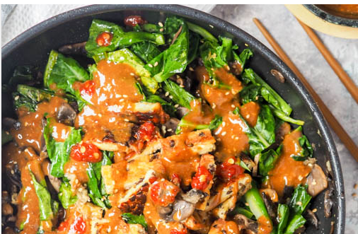 Нагрейте 2 столовые ложки масла на среднем огне.Приготовьте темпе до коричневого цвета, обжарив с каждой стороны. Обжарьте грибы и добавьте к темпе. Смешайте гайлан, имбирь, чеснок, тушите несколько минут. Добавьте к этой смеси темпе и грибы, продолжайте тушить. Смешайте отдельно ингредиенты