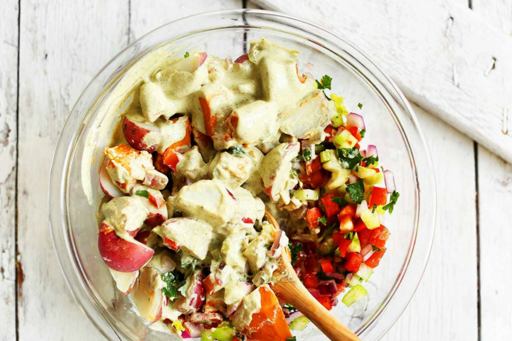 Обычный картофельный салат может легко превратиться в отличное вегетарианское блюдо! Для этого просто добавьте в него свежие овощи: сладкий перец, сельдерей и лук. Сделайте заправку из кешью, яблочного уксуса, пряной горчицы, кленового сиропа, чеснока, укропа и горячего соуса и наслаждайтесь прекрасным вкусом!