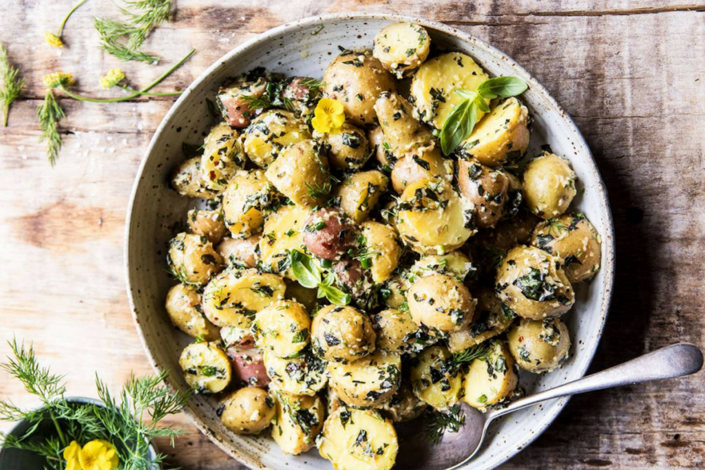 Этот здоровый рецепт салата из картофеля основан на домашнем майонезе из орехов кешью. Чтобы сделать такой майонез, пропитайте орехи кешью горячей водой и дайте настояться в течение 30 минут, а затем взбейте в блендере. Картофель, лимонный сок, свежие травы и дижонская горчица смешиваются с майонезом из кешью – и ваш лучший картофельный салат готов!