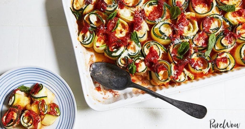 - На край каждого слайса из цуккини поместите примерно две столовые ложки начинки, затем скрутите аккуратный ролл и поместите его в блюдо для запекания.