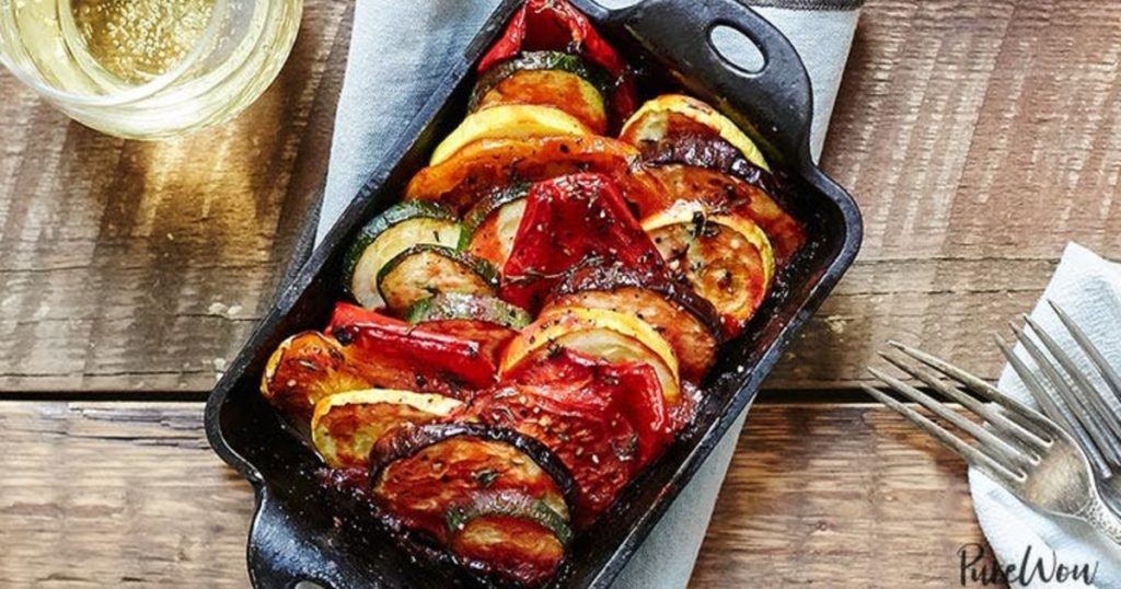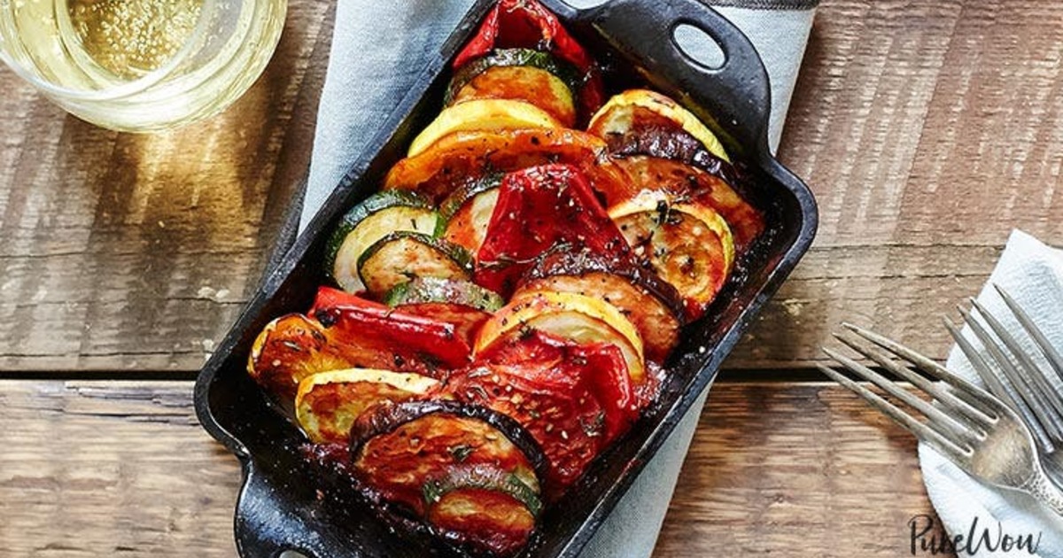 В одной порции рататуя всего 283 ккал, 18 г жира, 30 г углеводов, 6 г белка и 16 г сахара.
