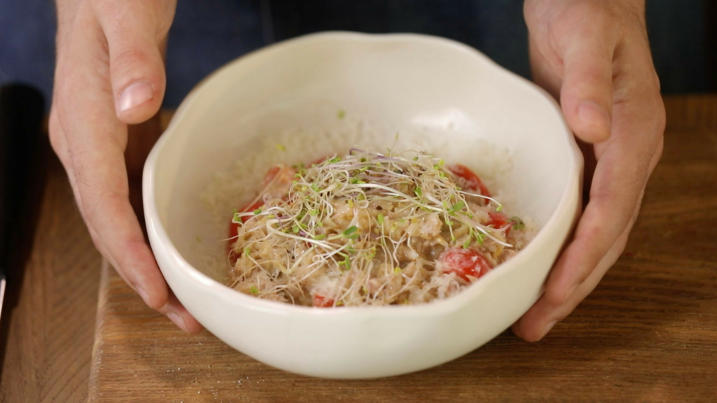 Сварите овсяные хлопья длительного приготовления в кипящей воде (готовьте около 15 минут). В готовую кашу добавьте нарезанные помидоры черри, тунец и разомните вилкой. Выложите в тарелку, посыпьте сыром и украсьте ростками зелени.