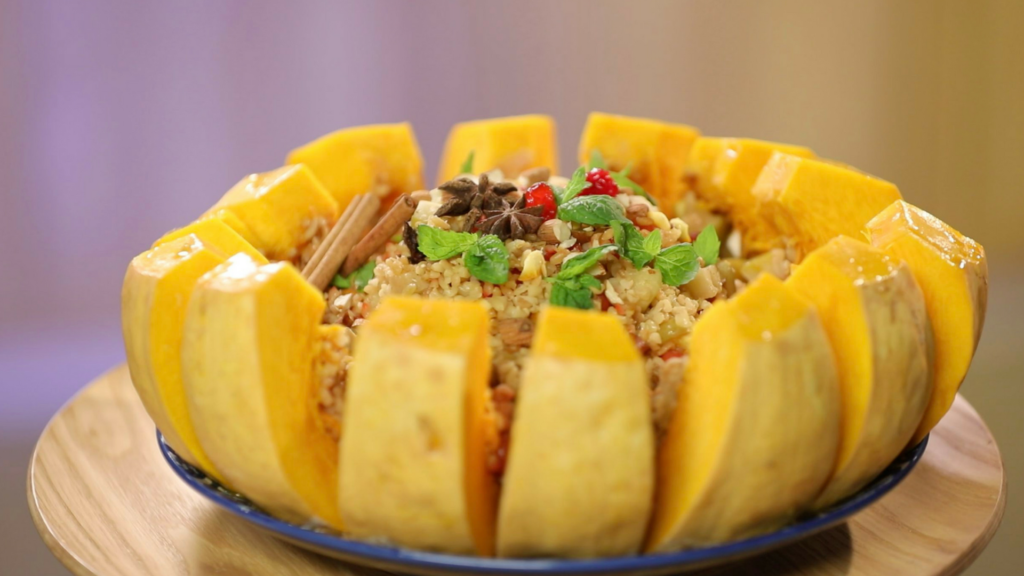 Срежьте верхушку тыквы и очистите ее от семян. В разогретое на сковороде оливковое масло добавьте вяленую вишню, нарезанное кубиками яблоко, половину миндаля, специи и булгур. Обжаривайте около 5 минут.