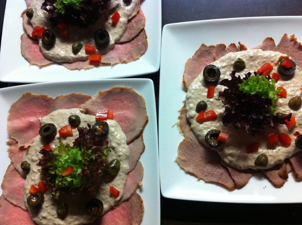 Когда бульон уже порядком остынет, приготовьте соус. Взбейте желтки с горчицей, солью и перцем, не прекращая взбивать, аккуратно влейте растительное масло – по сути, у вас получится майонез собственного приготовления. Но на этом приготовление соуса не заканчивается: добавьте к нему измельченного тунца, анчоусы, пару ложек бульона (от мяса) и половину порции каперсов. Переместите эту смесь в блендер и тщательно взбейте. Перед подачей тонко нарежьте остывшее мясо, полейте соусом и украсьте зеленью и каперсами.