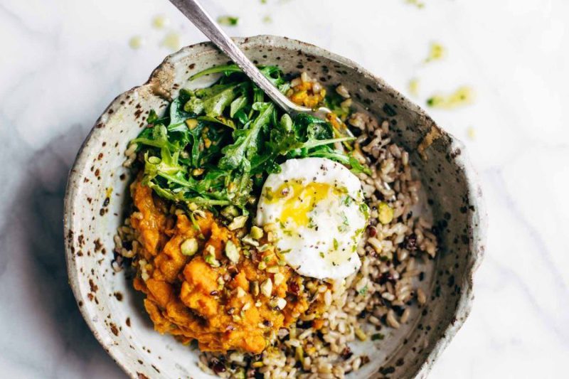 Отварить рис согласно инструкциям на упаковке. Батат вымыть, нарезать ломтиками, посыпать чесноком и куркумой. Запечь в духовке. Затем размять готовый батат, чтобы получилось пюре. Яйцо сварите вкрутую. Сначала выложите в тарелке рис, пюре из батата, затем рукколу, фисташки и залейте заправкой.