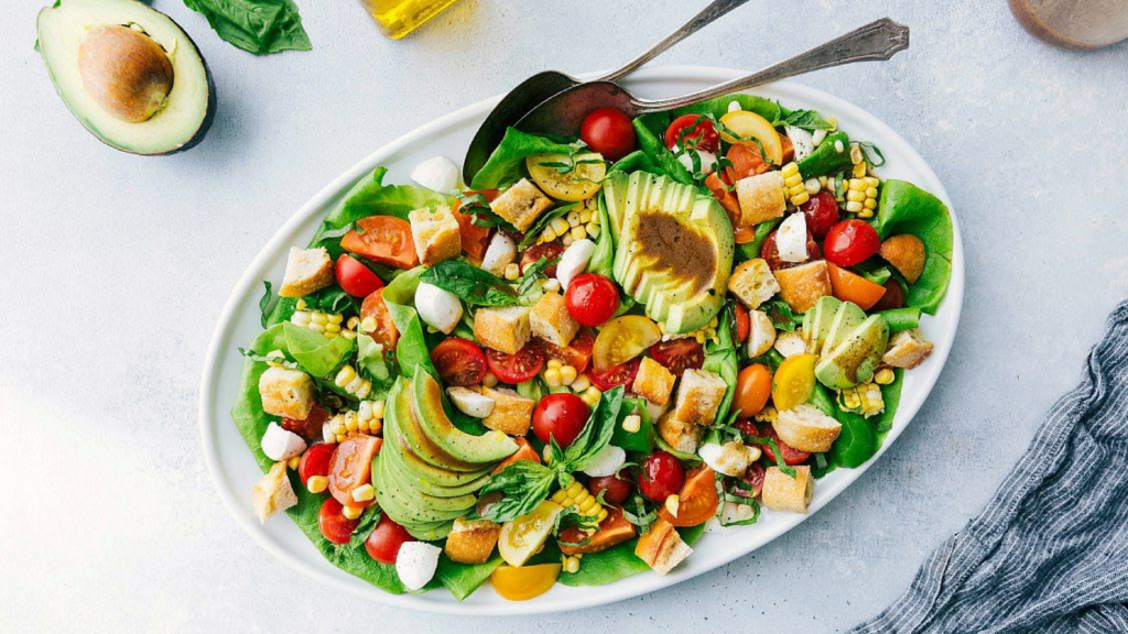 В большой миске смешайте половинки помидоров черри, четвертинки больших помидоров, шарики моцарелла, сырую кукурузу из початка (если не любите сырые зерна кукурузы, можно их предварительно поджарить) и кусочки салата, если хотите. Добавьте полностью охлажденные сухари и заправьте соусом. Дайте салату отдохнуть на 25-30 минут. Перед подачей на стол добавьте нарезанный авокадо, листья базилика, соль и перец при необходимости.